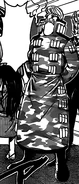 He is a tall man with mop-top hair, wide gray eyebrows and mustache, eyes without pupils and he has a rather big chin. He wears a brown chef's uniform with a military camouflage pattern while keeping its collar raised, and several cigars are attached all over his clothing.