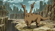 The Bicephalousaurus appears in the game Toriko: Bakushoku Gourmet Battle as an enemy and available ingredient. It can be encountered at Melk Mountain.