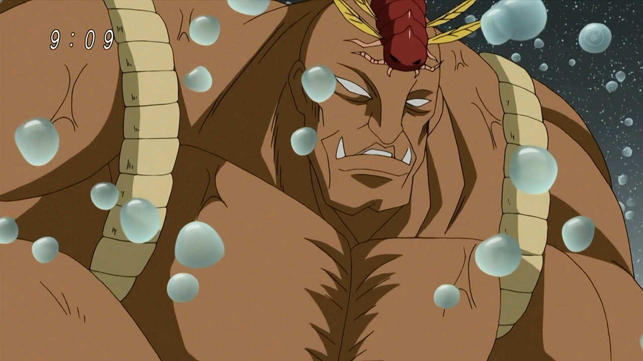 Boneless is an incredibly muscular tan-skinned man with white eyes without pupils and big tusks on his mouth. He wears a long red bug around his shoulders and forehead, whether it is dissected or alive is currently unknown.