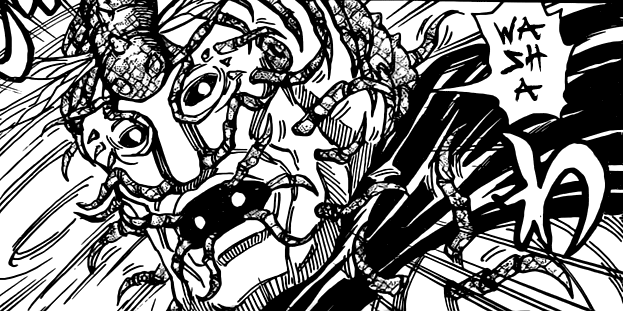 As Boneless, Kariu, Shigematsu, and Teppei ambush Toriko, Boneless is dispatched quickly by Toriko after Teppei injures Komatsu and leaves him in a critical state. Before he could do anything, his upper body is obliterated by Toriko's newly gained Appetite Demon's arm.[5] His body, along with Kariu's body, is later absorbed into the Giant Air Tree as fertilizer.[6]