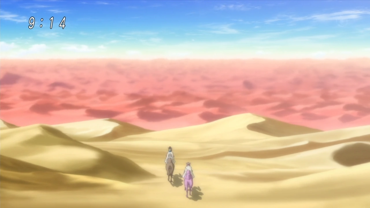 Red Sand Maze "Desert Labyrinth" (赤い砂漠の迷宮「デザートラビリンス」 Akai Sabaku no Meikyū "Dezāto Rabirinsu"), also known as the Gourmet Hunter Graveyard (美食屋の墓場 Bishoku-ya no Hakaba), is the most dangerous of the many deserts of Sand Garden. With the sand being mixed with iron (that is oxidized by the sun) and the blood of animals, it possesses an ominous red color. The heat there is much more higher than a normal desert, reaching 90°C but perceived as over 100°C because of the sand's reflection, and Toriko is reminded of the Gourmet World's Heat Planet. The heat also creates mirages, altering the whole space in the desert. There are a multitude of quicksand pits and fearsome beasts that dwell within the sand.