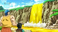 Toriko and Komatsu took a ride aboard Tom’s boat to reach Drunken Frenzy Island. Toriko explained that they’re riding across the Liquor Sea, where all water is alcoholic. Later, the island came in sight, and Toriko warned Komatsu of its age restriction, but Komatsu mentioned he’s also 25, surprising Toriko. After landing, Toriko explained their reason for going; Monchy requested the phantasmal King Vinegar from that island, as the Madam Fish wasn’t enough for the Ehou Maki. Suddenly, a Drunkard Frenzy Cattle rushed at them, but was easily defeated by Toriko. Moving on, they came across the Brandy Spring and its Brandy Tiger, and completely forgetting the reason they came, started enjoying the different ingredients around. In the end, a passing cloud of Champagne came raining down on them, and as it passed, an Emerald Dragon appeared.