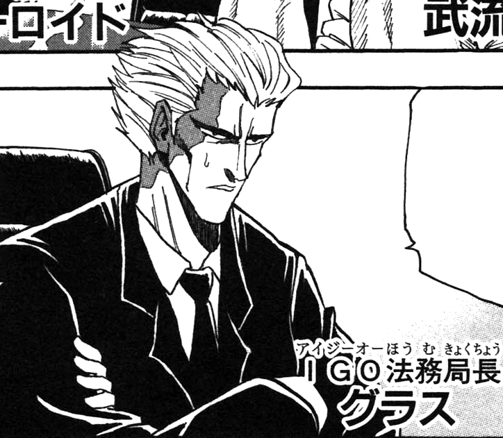 Glass was the IGO's former Judicial Affairs Bureau Director prior to his murder at the hands of Uumen Umeda. He was the one who ordered the arrest on Zebra of the Four Heavenly Kings.