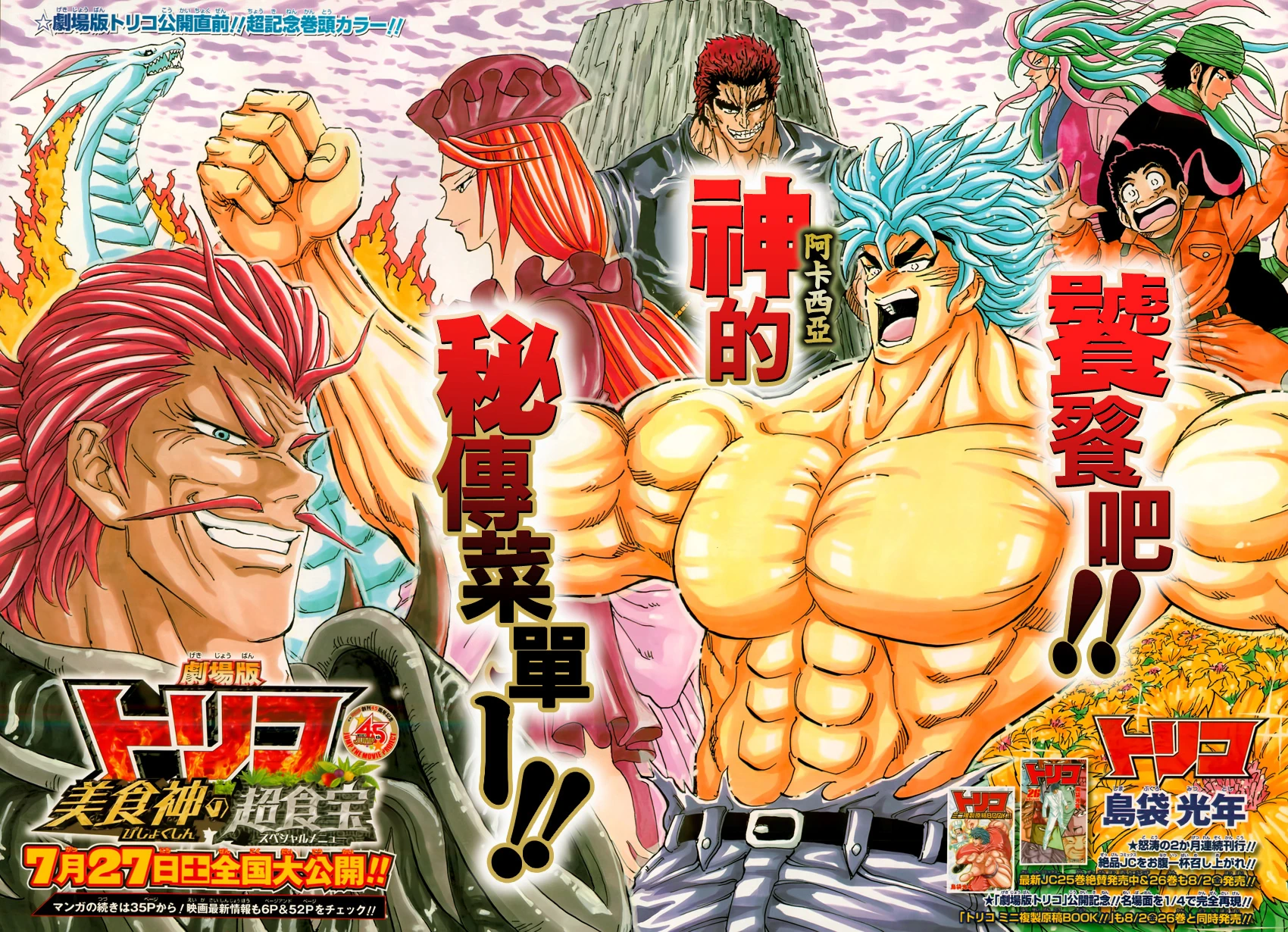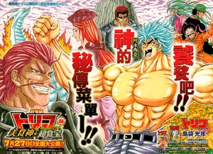 A colored page that promotes the new movie, and features an enraged and shirtless Toriko near a scared Komatsu, along with Coco, Sunny, Zebra, Ayame, Girim and a Wolf Fire Dragon engulfed in flames. The text reads: "Chow down on Acacia's Menu."