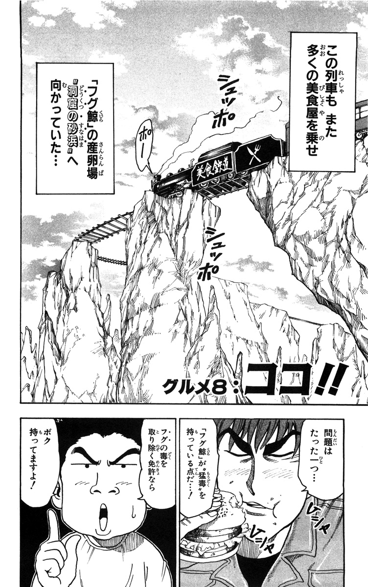 Toriko and Komatsu are on another journey together, this time travelling by train. The reason this time is for Toriko to eat an ingredient himself. While enjoying a bottle or ten of tequila and Platinum Lemons, Toriko and Komatsu are discussing the rumours of the Puffer Whale, their target this time. Toriko mentions that this ingredient is extremely poisonous and that there are only 10 people in the world who know how to take out the poison. A Bishokuya named Zongeh then starts loudly complaining about the low quality of the alcohol while smashing a bottle. He then tries to intimidate Toriko into giving him the alcohol by showing him his Full Course. Toriko laughs a bit and stands up, scaring Zongeh a bit, but gives him the alcohol anyways. Komatsu asks Toriko if he is okay with being challenged like that. Toriko answers that Zongeh's purpose was only to test the other Bishokuya and intimidate them. A shaking old man then asks them for some alcohol too and Toriko gives him all, stating that they are getting off at the next station, Gourmet Fortune.