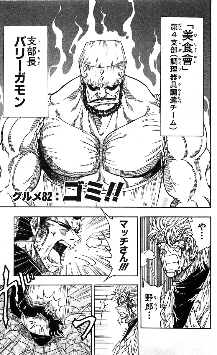 The cover page reintroduces Barrygamon, giving his name and position in the Gourmet Corp. It also shows Match and Ram during their fight with Barrygamon.