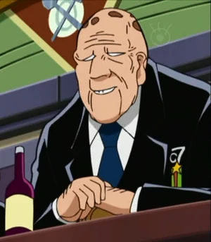 Nomarch is an elderly man with dark patches on his head with wrinkles around his face. His eyebrows obscure his eyes and he is shown to hunch over when he stands with his cane. He wears a black suit with a dark blue tie.