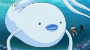 Toriko and Komatsu are traveling by train to a city where a person who can prepare the Puffer Whale resides. Toriko buys out all the alcohol in the train and drinks. He says to Komatsu that he's happy about being able to meet the legendary fish. Komatsu explains that the Puffer Whale is a rare ingredient which only shows itself in shallow waters once in every ten years. Toriko asks if he was more interested in the person who prepares it than eating it. Komatsu says that he wants to check out the cooking skills of the person who can prepare it as removing its poisonous parts are difficult. Toriko says that only ten people in the world are capable of preparing the Puffer Whale. A Gourmet Hunter dressed in a hunter's clothes confronts Toriko who had bought all the alcohol in the train. He demands alcohol from them and introduces himself as Zongeh. One of his followers shows a page which contains Zongeh's lifetime Full Course Menu which is Golden Salmon Roe for Hors d'Oeuvre, Snake Toad Liver for Soup, Striped Salmon for Fish Dish, Crab Pig for Meat Dish, Almond Cabbage for Salad, White Apple for Dessert, Energy Hennessy for Drink and Baby Garara Gator for Main Dish. Komatsu comments that they were every day ingredients. Toriko stands up and offers alcohol to Zongeh who sense's Toriko power and quietly takes away alcohol. Toriko explains that the whole train was filled with Gourmet Hunters who were aiming for the Puffer Whale and since they may need their help, its good to look out for each other. Then an old man comes to them and asks for some alcohol. Toriko and Komatsu give away some alcohol and the old man thanks them and says that he will repay his debt to them someday. Toriko and Komatsu alight at a station. There weren't any people walking in the city. Toriko says that fortune tellers have predicted that wild beasts will roam in the city freely so people are in their homes. Komatsu understands the talent of the fortune tellers living there as they were also the people who predicted the appearance of the Puffer Whale. Just then a wild beast Kuendon having a Capture Level of 10 appears. Komatsu gets instantly terrified. He sees a person walking towards them. The person is not attacked by the beast as he walked towards Toriko and Komatsu. Komatsu is amazed by the person's feat. Toriko introduces the person as one of the Four Heavenly Kings, Coco. Coco takes them to an isolated spot where he says his home is located. A huge crow comes flying to them. Coco introduces it as an Emperor Crow, Kiss. Toriko asks Coco about what happened to Zebra. Coco says that they have captured him and put him in the Gourmet Prison. Then in a place faraway, two mysterious people are discussing about the current affairs. Back at Coco's home, he says that Rainbow Fruit was a good choice for dessert though he saw it in his premonition. Toriko asks Coco about his lifetime Full Course Menu to which he says Lee Dragon's Tears for Soup, Breo Swordfish for Fish Dish, G2 Phoenix for Meat Dish, Neo Tomato for Salad, Domlom Fruit for Dessert. He adds that he wants to out nutrition balance to his Full Course and hasn't decided on his Drink, Hors d'Oeuvre and Main Dish. He then says that he already knows that they came with a request to capture the Puffer Whale. and its a tough job as its poison is very deadly. Komatsu says that if its poison sack is punctured then it becomes unsuitable for consumption and that's why its hard to prepare. Toriko says that it must taste really good if its hard to prepare. Coco says that his chances of preparing a Puffer Whale is 10%. Toriko says that was good enough as he can never do it. Coco says that the problem was that the Puffer Whale lays eggs at a depth of 800 meters deep in a beast filled cave but the most dangerous beast is the Devil Snake, a beast straight from the hell. He then says that the ancient Battle Wolf's and its ferocity are on par with each other. Toriko laughs and asks if he can see the shadow of death on them. Coco then agrees to help Toriko on his quest. Coco grows concerned upon seeing the shadow of death on Komatsu..