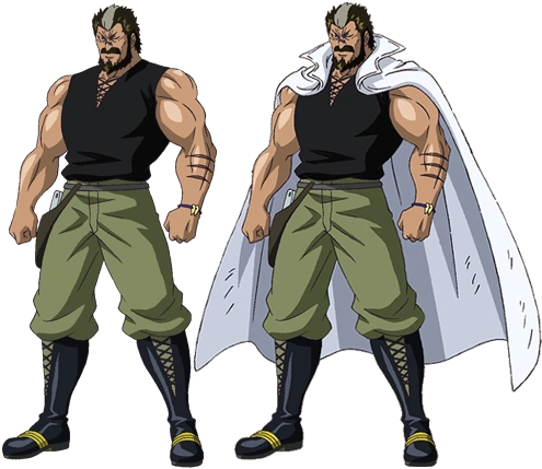 He is a very large, muscular man with a big, black beard and mustache and thick, black hair with a stripe of white hair down the middle. His typical attire consist of a black sleeveless v neck and laced shirt, green pants tuck inside knee high laced boots and a white cape. Noticeably on his left arm are three long scars and wears a teeth string bracelet and strapped on his right hip a brown holster like bag with an unknown object sticking out. He keeps one eye closed at all times, as well as a nose plug over the bridge of his nose. When these are removed, which he does when preparing to fight Grinpatch, his appearance becomes wilder and his muscles bulge, causing his clothes to tear.