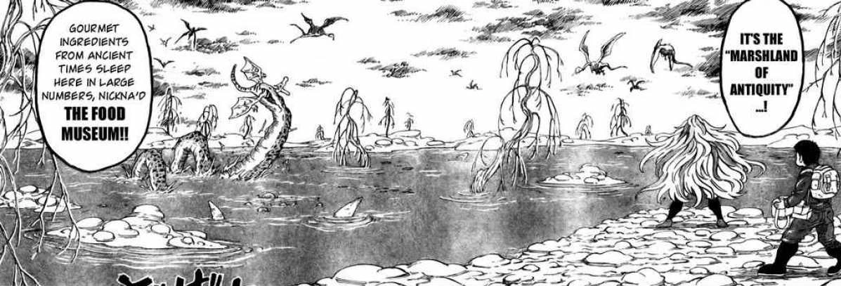 After Sunny and Komatsu left the Mushroom Woods, they passed through the Swamp of Antiquity in hopes of reaching the Regal Plateau faster and reuniting with the rest of their group. Upon arriving here, Komatsu became horrified at the many savage beasts eating each other in the water. When they reached the other side, Sunny saw the corpse of a mutilated beast which had been mercilessly killed by a member of the Gourmet Corp., a sight which greatly repulsed and angered him due to their vile cruelty.