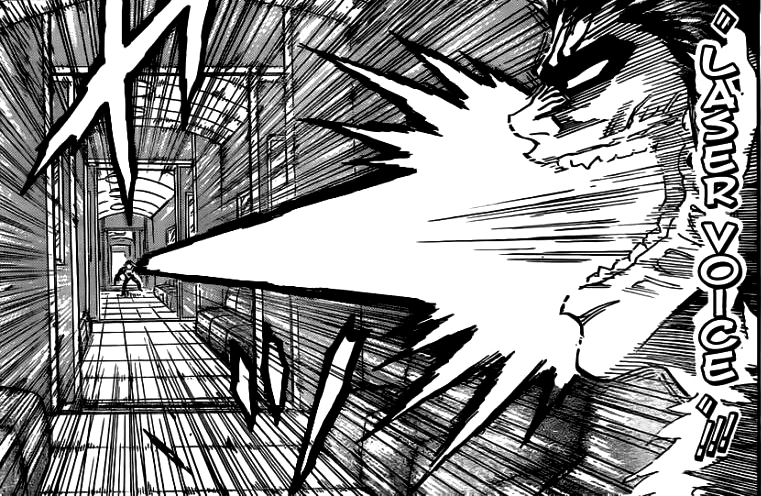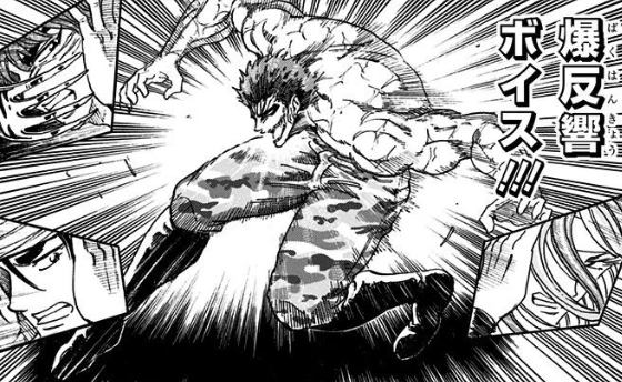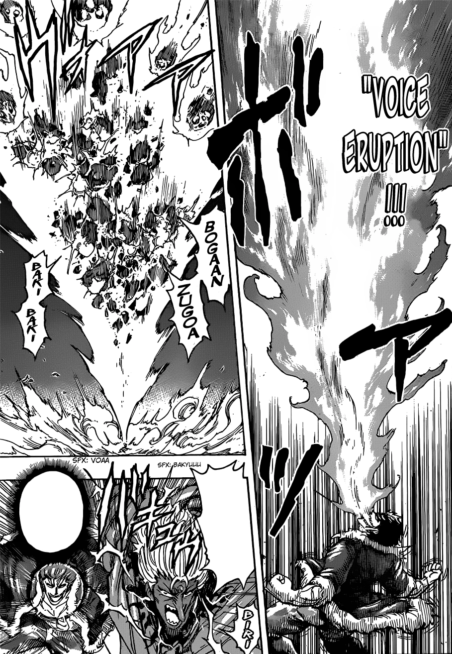 | Voice Cutter (ボイスカッター Boisu Kattā): Zebra uses his voice to cut his enemy (possibly through high-frequency vibrations). He is able to do this even with his back turned to the enemy. Rather than a shockwave, the vibrations produce thin 'blades' of sound.[13] This is most likely the attack he used to cause all the scars on Match's body. It consumes 250,000 calories.[9] | |||||||||||||||||||